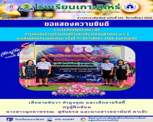 ขอแสดงความยินดี รางวัลเหรียญทองชนะเลิศ การแข่งขันการสร้างเกมสร้างสรรค์จากคอมพิวเตอร์ ม.1-3 งานศิลปหัตถกรรมนักเรียน ครั้งที่ 71 ปีการศึกษา 2566 ภูเก็ต