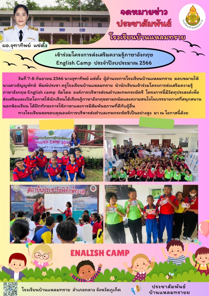 วันที่ 7-8 กันยายน 2566 นางจุฑาทิพย์ แซ่ตั้ง ผู้อำนวยการโรงเรียนบ้านแหลมทราย มอบหมายให้นางสาวธัญญพัทธ์ พิมพ์ประชา ครูโรงเรียนบ้านแหลมทราย นำนักเรียนเข้าร่วมโครงการส่งเสริมความรู้ภาษาอังกฤษ English camp จัดโดย องค์การบริหารส่วนตำบลเทพกระษัตรี โครงการนี้มีวัตถุประสงค์เพื่อส่งเสริมและเปิดโอกาสให้นักเรียนได้เรียนรู้ภาษาอังกฤษตามถนัดและความสนใจในบรรยายกาศที่สนุกสนานนอกห้องเรียน ได้ฝึกทักษะการใช้ภาษาและการมีสัมพันธภาพที่ดีกับผู้อื่น ทางโรงเรียนขอขอบคุณองค์การบริหารส่วตำบลเทพกระษัตรีเป็นอย่างสูง มา ณ โอกาสนี้ด้วย