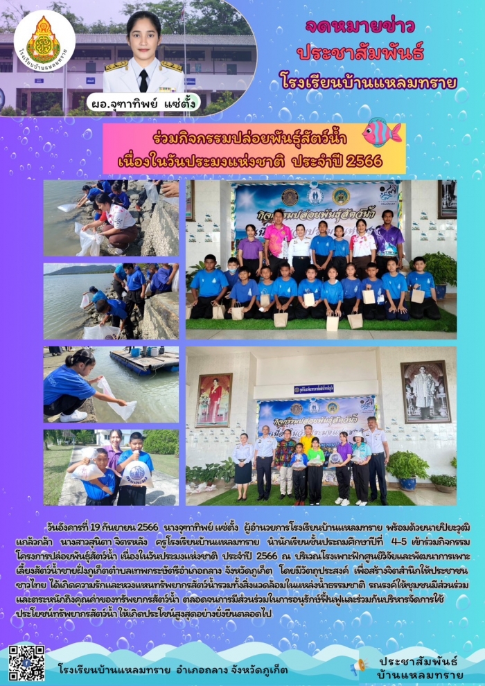 วันอังคารที่ 19 กันยายน 2566 นางจุฑาทิพย์ แซ่ตั้ง ผู้อำนวยการโรงเรียนบ้านแหลมทราย พร้อมด้วยนายปิยะวุฒิ แกล้วกล้า นางสาวสุนิตา จิตรหลัง ครูโรงเรียนบ้านแหลมทราย นำนักเรียนชั้นประถมศึกษาปีที่ 4-5 เข้าร่วมกิจกรรมโครงการปล่อยพันธ์ุสัตว์น้ำ เนื่องในวันประมงแห่งชาติ ประจำปี 2566 ณ บริเวณโรงเพาะฟักศูนย์วิจัยและพัฒนาการเพาะเลี้ยงสัตว์น้ำชายฝั่งภูเก็ตตำบลเทพกระษัตรีอำเภอถลาง จังหวัดภูเก็ต โดยมีวัตถุประสงค์ เพื่อสร้างจิตสำนึกให้ประชาชนชาวไทย ได้เกิดความรักและหวงแหนทรัพยากรสัตว์น้ำรวมทั้งสิ่งเเวดล้อมในแหล่งน้ำธรรมชาติ รณรงค์ให้ชุมชนมีส่วนร่วมและตระหนักถึงคุณค่าของทรัพยากรสัตว์น้ำ ตลอดจนการมีส่วนร่วมในการอนุรักษ์ฟื้นฟูและร่วมกันบริหารจัดการใช้ประโยชน์ทรัพยากรสัตว์น้ำ ให้เกิดประโชน์สูงสุดอย่างยั่งยืนตลอดไป