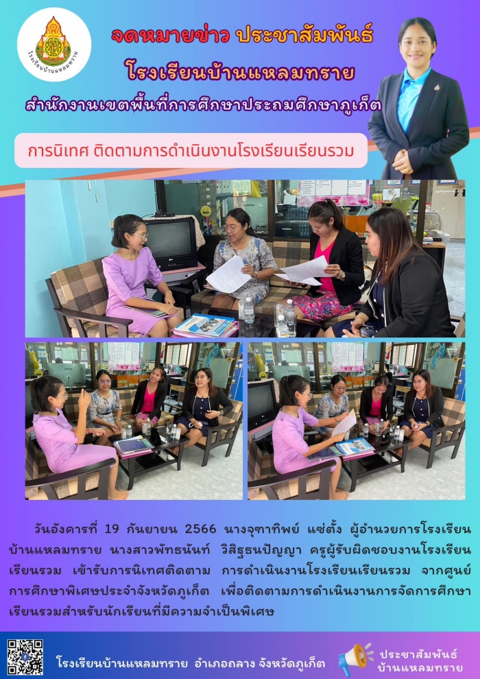 วันอังคารที่ 19 กันยายน 2566 นางจุฑาทิพย์ แซ่ตั้ง ผู้อำนวยการโรงเรียนบ้านแหลมทราย นางสาวพัทธนันท์ วิสิฐธนปัญญา ครูผู้รับผิดชอบงานโรงเรียนเรียนรวม เข้ารับการนิเทศติดตาม การดำเนินงานโรงเรียนเรียนรวม จากศูนย์การศึกษาพิเศษประจำจังหวัดภูเก็ต เพื่อติดตามการดำเนินงานการจัดการศึกษาเรียนรวมสำหรับนักเรียนที่มีความจำเป็นพิเศษ