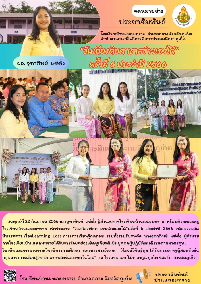 วันศุกร์ที่ 22 กันยายน 2566 นางจุฑาทิพย์ แซ่ตั้ง ผู้อำนวยการโรงเรียนบ้านแหลมทราย พร้อมด้วยคณะครูโรงเรียนบ้านแหลมทราย เข้าร่วมงาน ?วันเกียรติยศ เราสร้างเองได้?ครั้งที่ 6 ประจำปี 2566 พร้อมร่วมจัดนิทรรศการ เรื่องLearning Loss ภาวะการเรียนรู้ถดถอย รวมทั้งร่วมรับรางวัล นางจุฑาทิพย์ แซ่ตั้ง ผู้อำนวยการโรงเรียนบ้านแหลมทรายได้รับรางวัลยกย่องเชิดชูเกียรติเป็นบุคคลผู้ปฏิบัติตนดีงามตามมาตรฐานวิชาชีพและจรรยาบรรณวิชาชีทางการศึกษา และนางสาวอังคณา วิโรจน์วิศิษฐ์กุล ได้รับรางวัล ครูผู้สอนดีเด่น กลุ่มสาระการเรียนรู้วิชาวิทยาศาสตร์และเทคโนโลยี? ณ โรงแรม เอช โบ๊ท ลากูน ภูเก็ต รีสอร์ท จังหวัดภูเก็ต