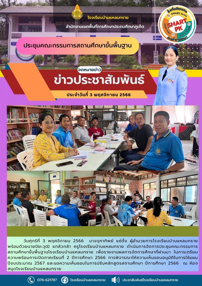 วันศุกร์ที่ 3 พฤศจิกายน 2566 นางจุฑาทิพย์ แซ่ตั้ง ผู้อำนวยการโรงเรียนบ้านแหลมทราย พร้อมด้วยนายปิยะวุฒิ แกล้วกล้า ครูโรงเรียนบ้านแหลมทราย ดำเนินการจัดการประชุมคณะกรรมการสถานศึกษาขั้นพื้นฐานโรงเรียนบ้านแหลมทราย เพื่อรายงานผลการจัดการศึกษาที่ผ่านมา ในการเตรียมความพร้อมการเปิดภาคเรียนที่ 2 ปีการศึกษา 2566 การพิจารณาให้ความเห็นชอบอนุมัติในการใช้แผนปีงบประมาณ 2567 และขอความเห็นชอบในการปรับหลักสูตรสถานศึกษา ปีการศึกษา 2566 ณ ห้องสมุดโรงเรียนบ้านแหลมทราย