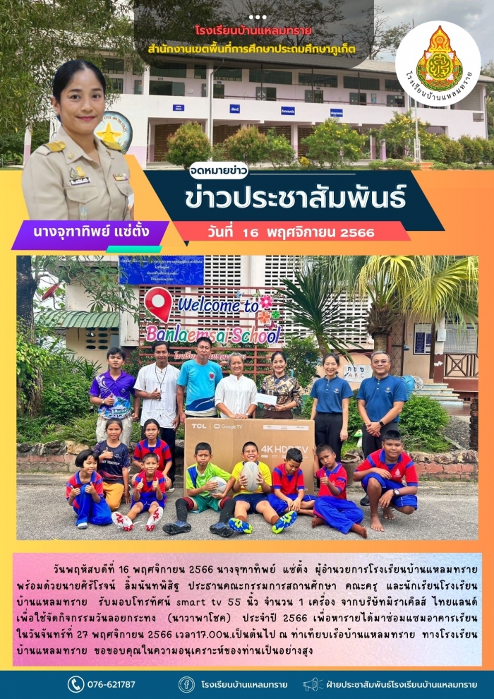 วันพฤหัสบดีที่ 16 พฤศจิกายน 2566 นางจุฑาทิพย์ แซ่ตั้ง ผู้อำนวยการโรงเรียนบ้านแหลมทราย พร้อมด้วยนายศิริโรจน์ ลิ้มนันทพิสิฐ ประธานคณะกรรมการสถานศึกษา คณะครู และนักเรียนโรงเรียนบ้านแหลมทราย รับมอบโทรทัศน์ smart tv 55 นิ้ว จำนวน 1 เครื่อง จากบริษัทมิราเคิลส์ ไทยแลนด์ เพื่อใช้จัดกิจกรรมวันลอยกระทง (นาวาพาโชค) ประจำปี 2566 เพื่อหารายได้มาซ่อมแซมอาคารเรียน ในวันจันทร์ที่ 27 พฤศจิกายน 2566 เวลา17.00น.เป็นต้นไป ณ ท่าเทียบเรือบ้านแหลมทราย ทางโรงเรียนบ้านแหลมทราย ขอขอบคุณในความอนุเคราะห์ของท่านเป็นอย่างสูง