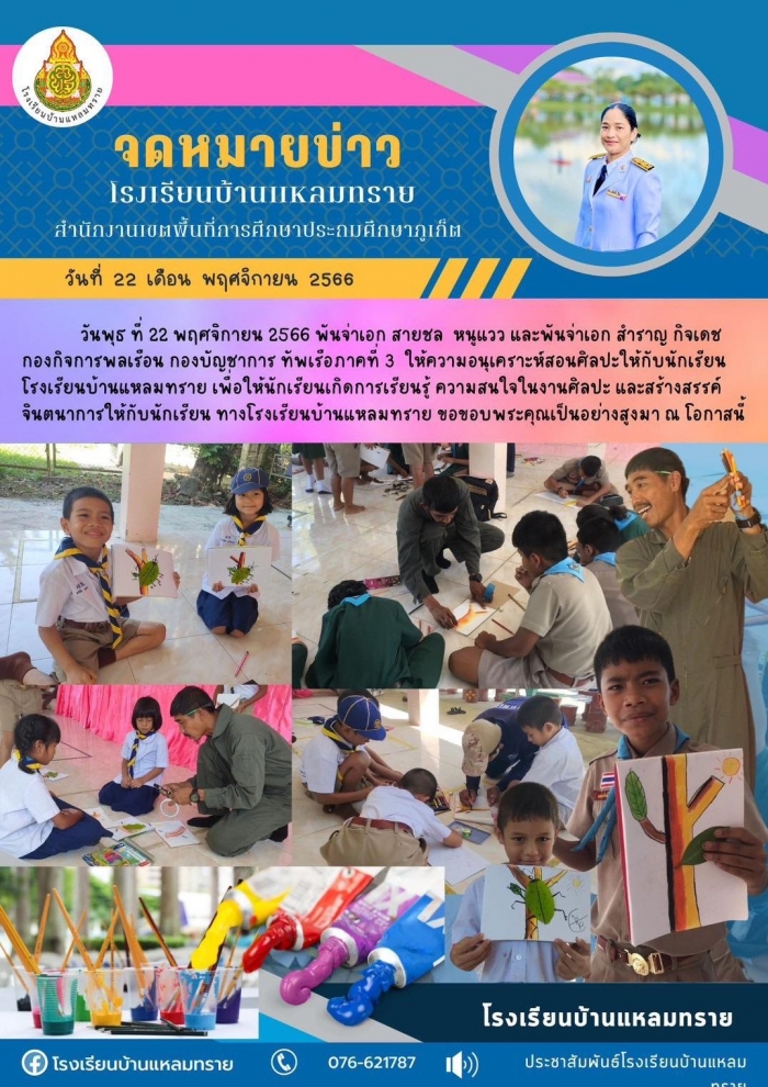 วันพุธ ที่ 22 พฤศจิกายน 2566 พันจ่าเอก สายชล หนูแวว และพันจ่าเอก สำราญ กิจเดช กองกิจการพลเรือน กองบัญชาการ ทัพเรือภาคที่ 3 ให้ความอนุเคราะห์สอนศิลปะให้กับนักเรียนโรงเรียนบ้านแหลมทราย เพื่อให้นักเรียนเกิดการเรียนรู้ ความสนใจในงานศิลปะ และสร้างสรรค์จินตนาการให้กับนักเรียน ทางโรงเรียนบ้านแหลมทราย ขอขอบพระคุณเป็นอย่างสูงมา ณ โอกาสนี้