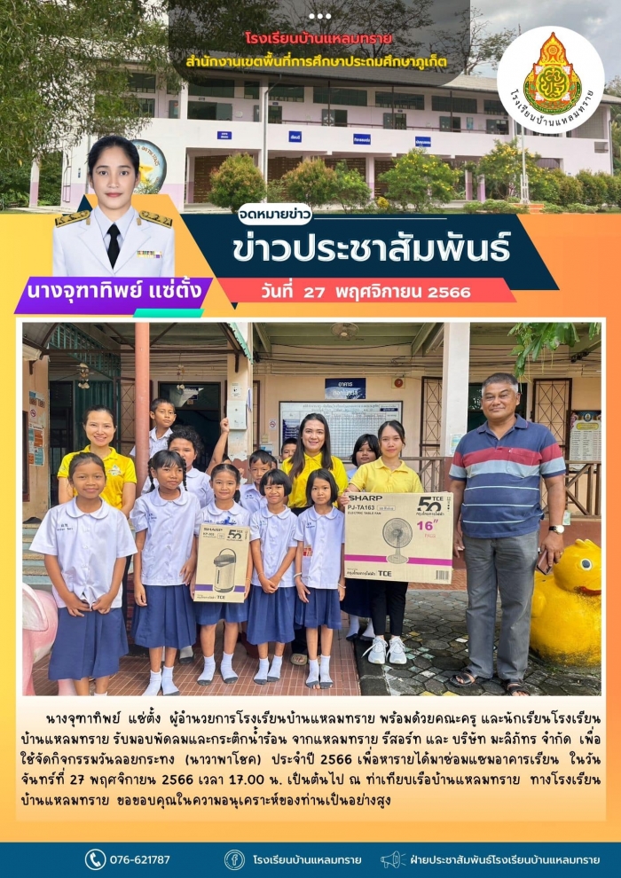 นางจุฑาทิพย์ แซ่ตั้ง ผู้อำนวยการโรงเรียนบ้านแหลมทราย พร้อมด้วยคณะครู และนักเรียนโรงเรียนบ้านแหลมทราย รับมอบพัดลมและกระติกน้ำร้อน จากแหลมทราย รีสอร์ท และ บริษัท มะลิภัทร จำกัด เพื่อใช้จัดกิจกรรมวันลอยกระทง (นาวาพาโชค) ประจำปี 2566 เพื่อหารายได้มาซ่อมแซมอาคารเรียน ในวันจันทร์ที่ 27 พฤศจิกายน 2566 เวลา 17.00 น. เป็นต้นไป ณ ท่าเทียบเรือบ้านแหลมทราย ทางโรงเรียนบ้านแหลมทราย ขอขอบคุณในความอนุเคราะห์ของท่านเป็นอย่างสูง