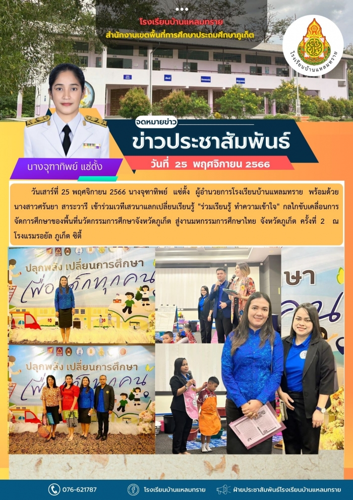 วันเสาร์ที่ 25 พฤศจิกายน 2566 นางจุฑาทิพย์ แซ่ตั้ง ผู้อำนวยการโรงเรียนบ้านแหลมทราย พร้อมด้วยนางสาวศรันยา สาระวารี เข้าร่วมเวทีเสวนาแลกเปลี่ยนเรียนรู้ "ร่วมเรียนรู้ ทำความเข้าใจ" กลไกขับเคลื่อนการจัดการศึกษาของพื้นที่นวัตกรรมการศึกษาจังหวัดภูเก็ตสู่งานมหกรรมการศึกษาไทย จังหวัดภูเก็ต ครั้งที่ 2 ณ โรงแรมรอยัล ภูเก็ต ซิตี้