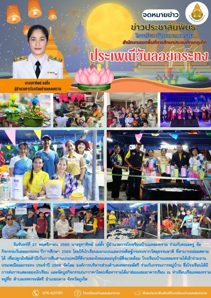 วันจันทร์ที่ 27 พฤศจิกายน 2566 นางจุฑาทิพย์ แซ่ตั้ง ผู้อำนวยการโรงเรียนบ้านแหลมทราย ร่วมกับคณะครู จัดกิจกรรมวันลอยกระทง ปีการศึกษา 2566 โดยให้นักเรียนออกแบบและประดิษฐ์กระทงจากวัสดุธรรมชาติ ที่สามารถย่อยสลายได้ เพื่อปลูกฝังจิตสำนึกในการสืบสานประเพณีที่ดีงามของไทยและอนุรักษ์สิ่งแวดล้อม โรงเรียนบ้านแหลมทรายได้เข้าร่วมงานประเพณีลอยกระทง ประจำปี 2566 จัดโดย องค์การบริหารส่วนตำบลเทพกระษัตรี ร่วมกับกรรมการหมู่บ้าน ซึ่งโรงเรียนได้มีการส่งการแสดงของนักเรียน และจัดบูธกิจกรรม(นาวาพาโชค) เพื่อหารายได้มาซ่อมแซมอาคารเรียน ณ ท่าเทียบเรือแหลมทราย หมู่ที่6 ตำบลเทพกระษัตรี อำเภอถลาง จังหวัดภูเก็ต