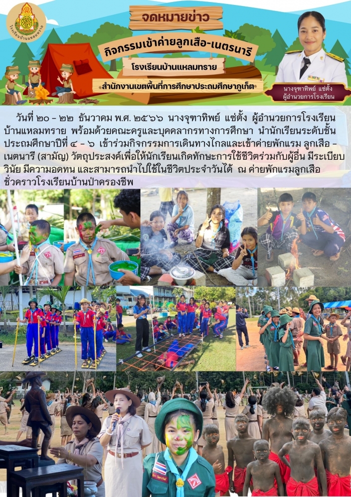 วันที่ ๒๐ - ๒๒ ธันวาคม พ.ศ. ๒๕๖๖ นางจุฑาทิพย์ แซ่ตั้ง ผู้อำนวยการโรงเรียนบ้านแหลมทราย พร้อมด้วยคณะครูและบุคคลากรทางการศึกษา นำนักเรียนระดับชั้นประถมศึกษาปีที่ ๔ - ๖ เข้าร่วมกิจกรรมการเดินทางไกลและเข้าค่ายพักแรม ลูกเสือ - เนตนารี (สามัญ) วัตถุประสงค์เพื่อให้นักเรียนเกิดทักษะการใช้ชีวิตร่วมกับผู้อื่น มีระเบียบวินัย มีความอดทน และสามารถนำไปใช้ในชีวิตประจำวันได้ ณ ค่ายพักแรมลูกเสือชั่วคราวโรงเรียนบ้านป่าครองชีพ