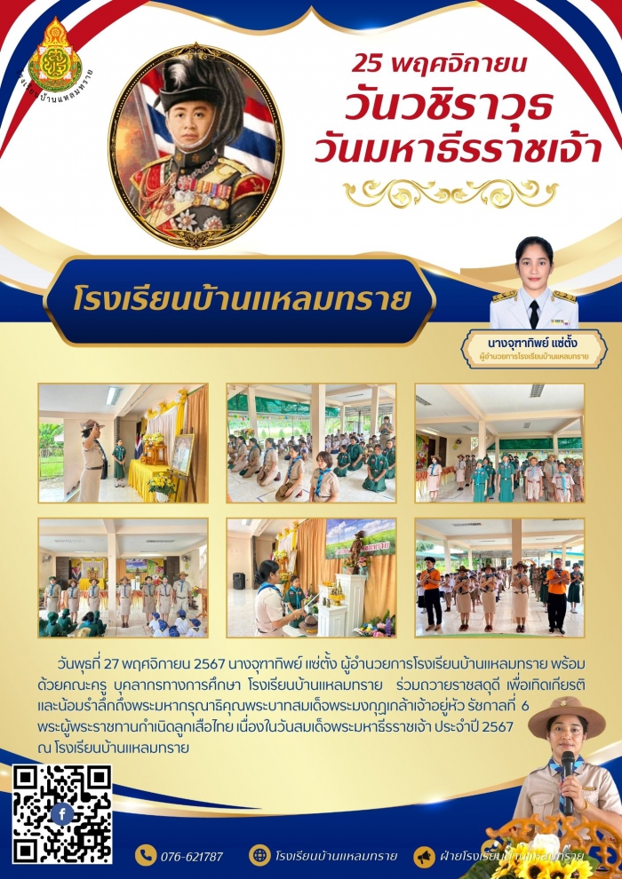 วันพุธที่ 27 พฤศจิกายน 2567 นางจุฑาทิพย์ แซ่ตั้ง ผู้อำนวยการโรงเรียนบ้านแหลมทราย พร้อมด้วยคณะครู บุคลากรทางการศึกษา โรงเรียนบ้านแหลมทราย ร่วมถวายราชสดุดี เพื่อเทิดเกียรติ และน้อมรำลึกถึงพระมหากรุณาธิคุณพระบาทสมเด็จพระมงกุฏเกล้าเจ้าอยู่หัว รัชกาลที่ 6 พระผู้พระราชทานกำเนิดลูกเสือไทย เนื่องในวันสมเด็จพระมหาธีรราชเจ้า ประจำปี 2567 ณ โรงเรียนบ้านแหลมทราย