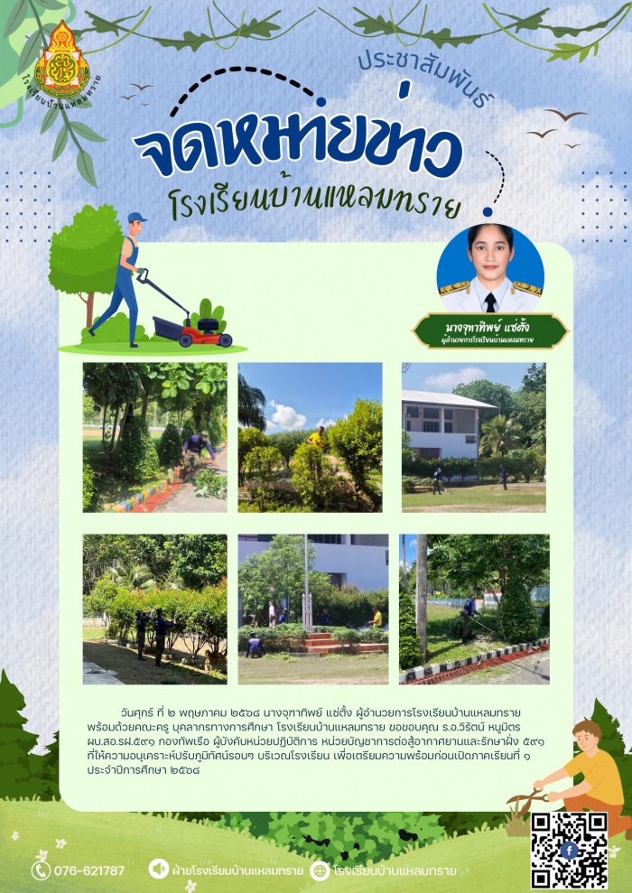 วันศุกร์ ที่ ๒ พฤษภาคม ๒๕๖๘ นางจุฑาทิพย์ แซ่ตั้ง ผู้อำนวยการโรงเรียนบ้านแหลมทราย พร้อมด้วยคณะครู บุคลากรทางการศึกษา โรงเรียนบ้านแหลมทราย ขอขอบคุณ ร.อ.วิรัตน์ หนูมิตร ผบ.สอ.รฝ.๕๙๑ กองทัพเรือ ผู้บังคับหน่วยปฏิบัติการ หน่วยบัญชาการต่อสู้อากาศยานและรักษาฝั่ง ๕๙๑ ที่ให้ความอนุเคราะห์ปรับภูมิทัศน์รอบๆ บริเวณโรงเรียน เพื่อเตรียมความพร้อมก่อนเปิดภาคเรียนที่ ๑ ประจำปีการศึกษา ๒๕๖๘