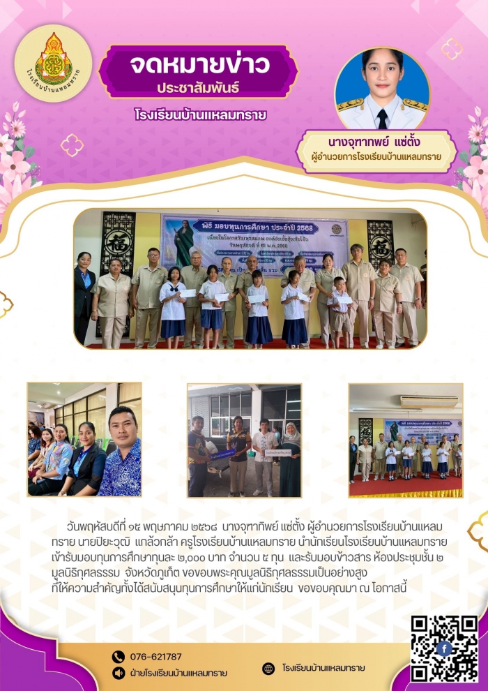วันพฤหัสบดีที่ ๑๕ พฤษภาคม ๒๕๖๘ นางจุฑาทิพย์ แซ่ตั้ง ผู้อำนวยการโรงเรียนบ้านแหลมทราย นายปิยะวุฒิ แกล้วกล้า ครูโรงเรียนบ้านแหลมทราย นำนักเรียนโรงเรียนบ้านแหลมทราย เข้ารับมอบทุนการศึกษาทุนละ ๒,๐๐๐ บาท จำนวน ๕ ทุน และรับมอบข้าวสาร ห้องประชุมชั้น ๒ มูลนิธิกุศลธรรม จังหวัดภูเก็ต ขอขอบพระคุณมูลนิธิกุศลธรรมเป็นอย่างสูง ที่ให้ความสำคัญทั้งได้สนับสนุนทุนการศึกษาให้แก่นักเรียน ขอขอบคุณมา ณ โอกาสนี้