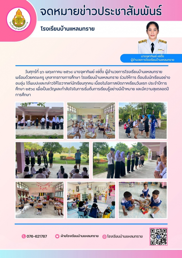 วันศุกร์ที่ ๑๖ พฤษภาคม ๒๕๖๘ นางจุฑาทิพย์ แซ่ตั้ง ผู้อำนวยการโรงเรียนบ้านแหลมทราย พร้อมด้วยคณะครู บุคลากรทางการศึกษา โรงเรียนบ้านแหลมทราย ร่วมให้การต้อนรับนักเรียนอย่างอบอุ่น ได้พบปะและกล่าวให้โอวาทแก่นักเรียนทุกคน เนื่องในโอกาสเปิดภาคเรียนวันแรก ประจำปีการศึกษา ๒๕๖๘ เพื่อเป็นขวัญและกำลังใจในการเริ่มต้นการเรียนรู้อย่างมีเป้าหมาย และมีความสุขตลอดปีการศึกษา
