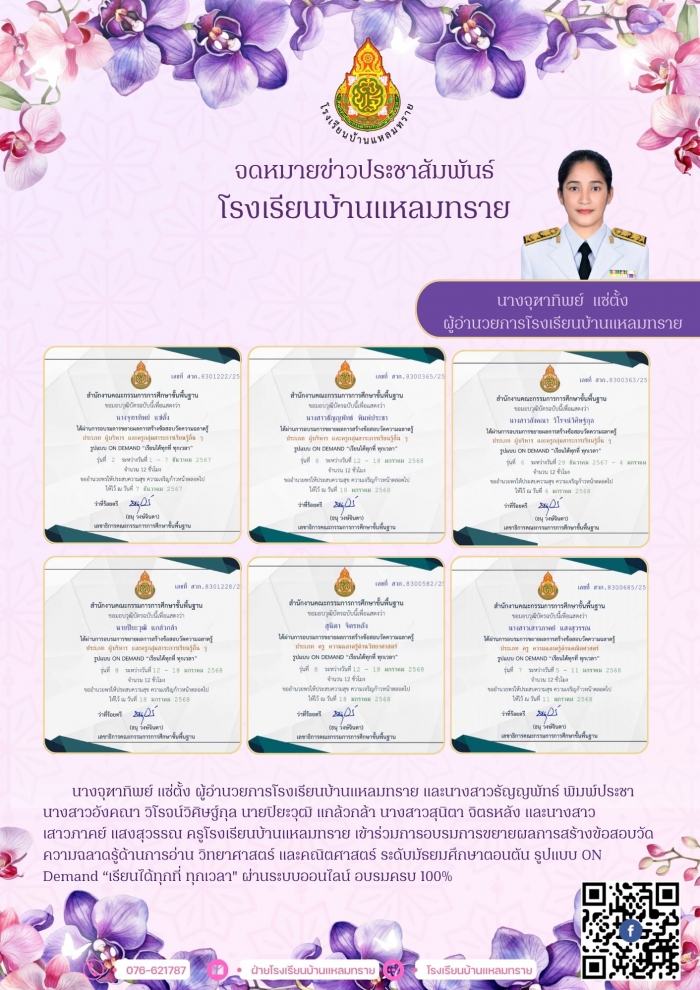 นางจุฑาทิพย์ แซ่ตั้ง ผู้อำนวยการโรงเรียนบ้านแหลมทราย และนางสาวธัญญพัทธ์ พิมพ์ประชา นางสาวอังคณา วิโรจน์วิศิษฐ์กุล นายปิยะวุฒิ แกล้วกล้า นางสาวสุนิตา จิตรหลัง และนางสาวเสาวภาคย์ แสงสุวรรณ ครูโรงเรียนบ้านแหลมทราย เข้าร่วมการอบรมการขยายผลการสร้างข้อสอบวัดความฉลาดรู้ด้านการอ่าน วิทยาศาสตร์ และคณิตศาสตร์ ระดับมัธยมศึกษาตอนตัน รูปแบบ ON Demand ?เรียนได้ทุกที่ ทุกเวลา" ผ่านระบบออนไลน์ อบรมครบ 100%