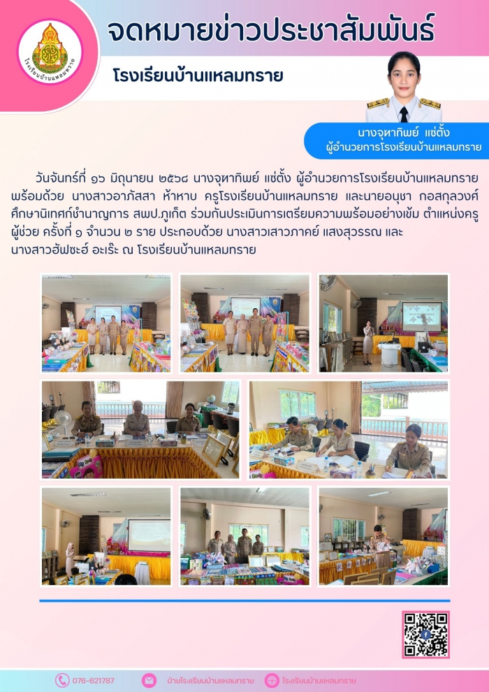 วันจันทร์ที่ ๑๖ มิถุนายน ๒๕๖๘ นางจุฑาทิพย์ แซ่ตั้ง ผู้อำนวยการโรงเรียนบ้านแหลมทราย พร้อมด้วย นางสาวอาภัสสา ห้าหาบ ครูโรงเรียนบ้านแหลมทราย และนายอนุชา กอสกุลวงศ์ ศึกษานิเทศก์ชำนาญการ สพป.ภูเก็ต ร่วมกันประเมินการเตรียมความพร้อมอย่างเข้ม ตำแหน่งครูผู้ช่วย ครั้งที่ ๑ จำนวน ๒ ราย ประกอบด้วย นางสาวเสาวภาคย์ แสงสุวรรณ และนางสาวฮัฟซะฮ์ อะเร๊ะ ณ โรงเรียนบ้านแหลมทราย