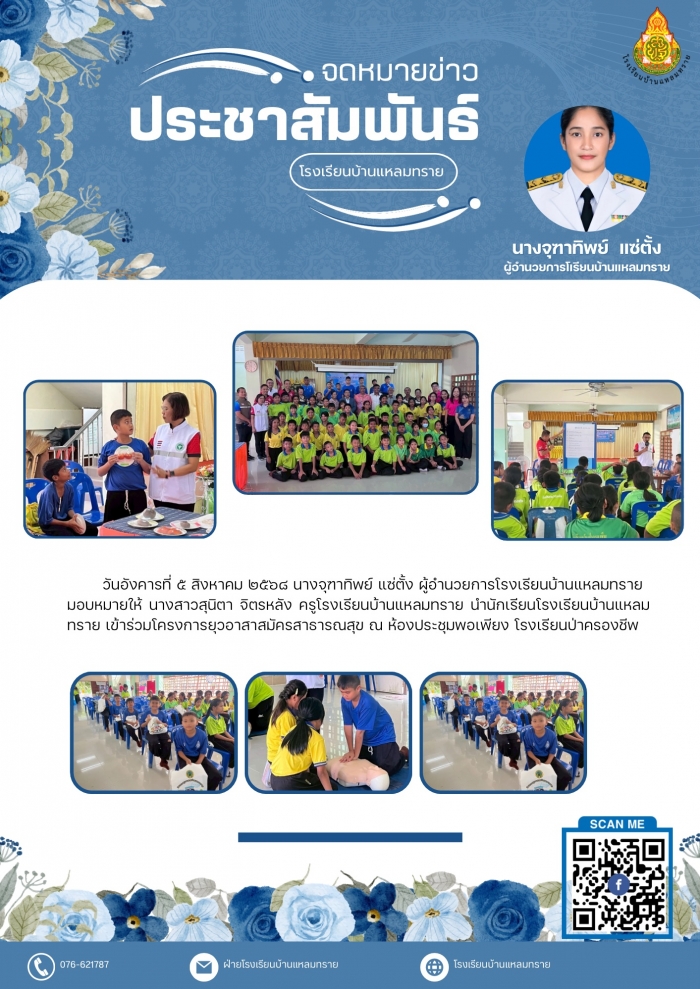 วันอังคารที่ ๕ สิงหาคม ๒๕๖๘ นางจุฑาทิพย์ แซ่ตั้ง ผู้อำนวยการโรงเรียนบ้านแหลมทราย มอบหมายให้ นางสาวสุนิตา จิตรหลัง ครูโรงเรียนบ้านแหลมทราย นำนักเรียนโรงเรียนบ้านแหลมทราย เข้าร่วมโครงการยุวอาสาสมัครสาธารณสุข ณ ห้องประชุมพอเพียง โรงเรียนป่าครองชีพ