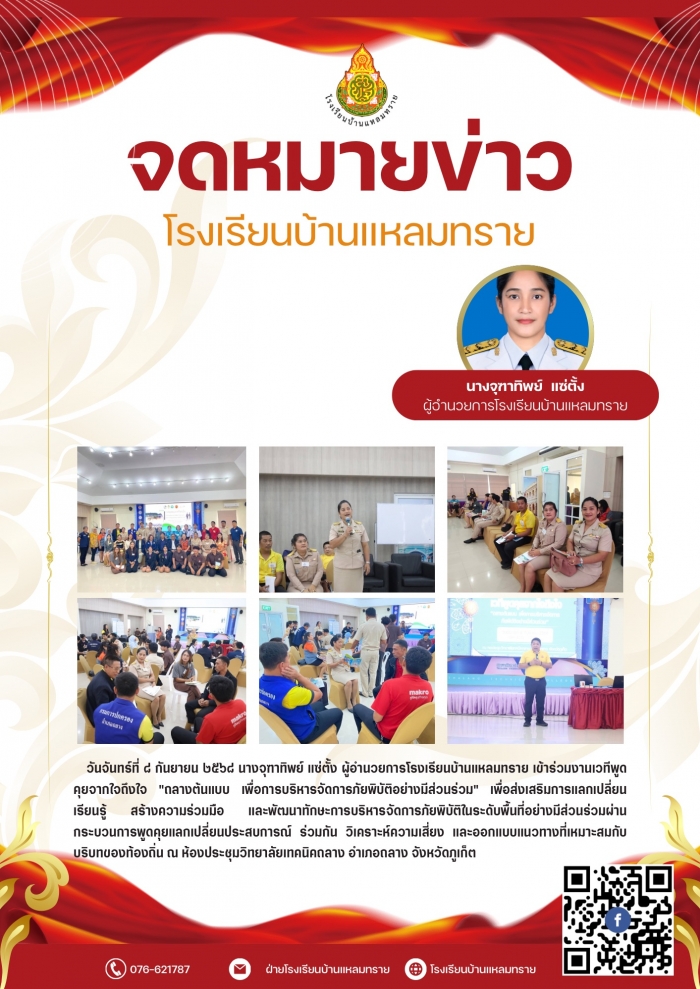 วันจันทร์ที่ ๘ กันยายน ๒๕๖๘ นางจุฑาทิพย์ แซ่ตั้ง ผู้อำนวยการโรงเรียนบ้านแหลมทราย เข้าร่วมงานเวทีพูดคุยจากใจถึงใจ "ถลางต้นแบบ เพื่อการบริหารจัดการภัยพิบัติอย่างมีส่วนร่วม" เพื่อส่งเสริมการแลกเปลี่ยนเรียนรู้ สร้างความร่วมมือ และพัฒนาทักษะการบริหารจัดการภัยพิบัติในระดับพื้นที่อย่างมีส่วนร่วมผ่านกระบวนการพูดคุยแลกเปลี่ยนประสบการณ์ ร่วมกัน วิเคราะห์ความเสี่ยง และออกแบบแนวทางที่เหมาะสมกับบริบทของท้องถิ่น ณ ห้องประชุมวิทยาลัยเทคนิคถลาง อำเภอถลาง จังหวัดภูเก็ต