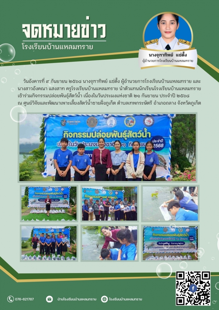 วันอังคารที่ ๙ กันยายน ๒๕๖๘ นางจุฑาทิพย์ แซ่ตั้ง ผู้อำนวยการโรงเรียนบ้านแหลมทราย และนางสาวอังคณา แสงสาท ครูโรงเรียนบ้านแหลมทราย นำตัวแทนนักเรียนโรงเรียนบ้านแหลมทราย เข้าร่วมกิจกรรมปล่อยพันธุ์สัตว์น้ำ เนื่องในวันประมงแห่งชาติ ๒๑ กันยายน ประจำปี ๒๕๖๘ ณ ศูนย์วิจัยและพัฒนาเพาะเลี้ยงสัตว์น้ำชายฝั่งภูเก็ต ตำบลเทพกระษัตรี อำเภอถลาง จังหวัดภูเก็ต