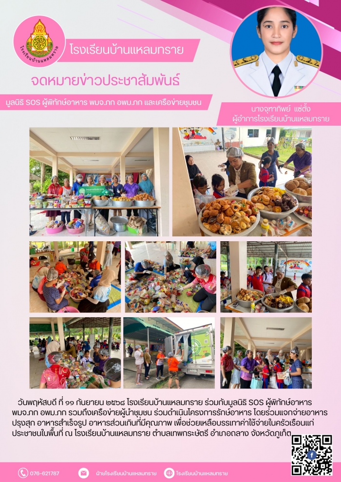 วันพฤหัสบดี ที่ ๑๑ กันยายน ๒๕๖๘ โรงเรียนบ้านแหลมทราย ร่วมกับมูลนิธิ SOS ผู้พิทักษ์อาหาร พมจ.ภก อพม.ภก รวมถึงเครือข่ายผู้นำชุมชน ร่วมดำเนินโครงการรักษ์อาหาร โดยร่วมแจกจ่ายอาหารปรุงสุก อาหารสำเร็จรูป อาหารส่วนเกินที่มีคุณภาพ เพื่อช่วยเหลือบรรเทาค่าใช้จ่ายในครัวเรือนแก่ประชาชนในพื้นที่ ณ โรงเรียนบ้านแหลมทราย ตำบลเทพกระษัตรี อำเภอถลาง จังหวัดภูเก็ต