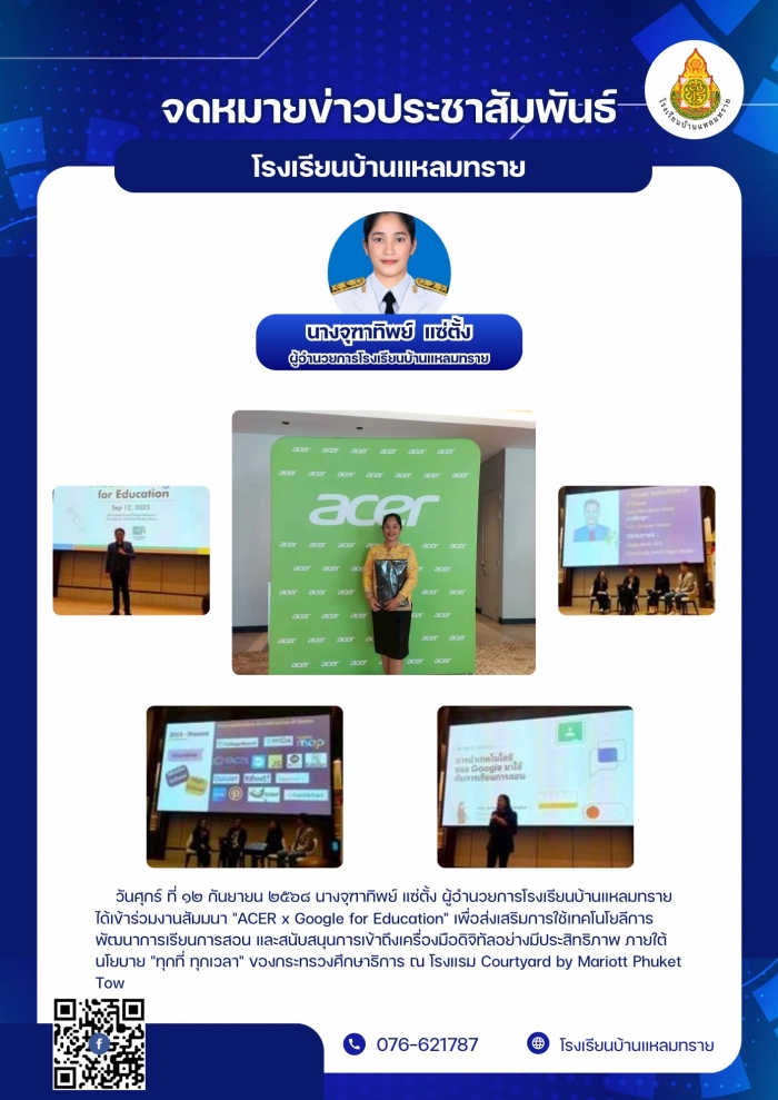วันศุกร์ ที่ ๑๒ กันยายน ๒๕๖๘ นางจุฑาทิพย์ แซ่ตั้ง ผู้อำนวยการโรงเรียนบ้านแหลมทราย ได้เข้าร่วมงานสัมมนา "ACER x Google for Education" เพื่อส่งเสริมการใช้เทคโนโยลีการพัฒนาการเรียนการสอน และสนับสนุนการเข้าถึงเครื่องมือดิจิทัลอย่างมีประสิทธิภาพ ภายใต้นโยบาย "ทุกที่ ทุกเวลา" ของกระทรวงศึกษาธิการ ณ โรงแรม Courtyard by Mariott Phuket Tow