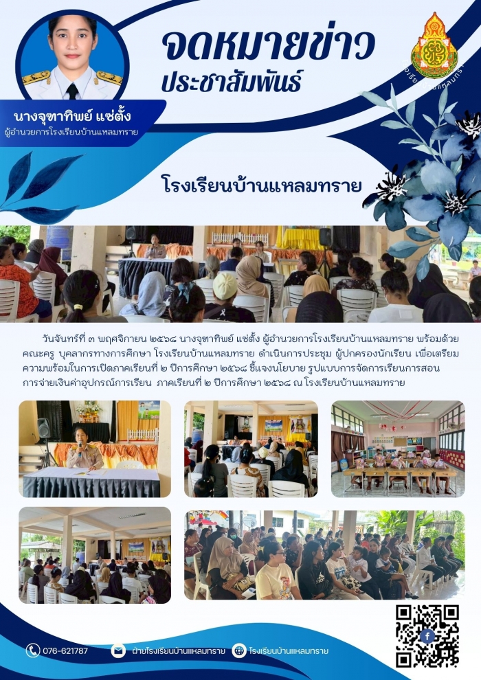 วันจันทร์ที่ ๓ พฤศจิกายน ๒๕๖๘ นางจุฑาทิพย์ แซ่ตั้ง ผู้อำนวยการโรงเรียนบ้านแหลมทราย พร้อมด้วยคณะครู บุคลากรทางการศึกษา โรงเรียนบ้านแหลมทราย ดำเนินการประชุม ผู้ปกครองนักเรียน เพื่อเตรียมความพร้อมในการเปิดภาคเรียนที่ ๒ ปีการศึกษา ๒๕๖๘ ชี้เเจงนโยบาย รูปแบบการจัดการเรียนการสอน การจ่ายเงินค่าอุปกรณ์การเรียน ภาคเรียนที่ ๒ ปีการศึกษา ๒๕๖๘ ณ โรงเรียนบ้านแหลมทราย