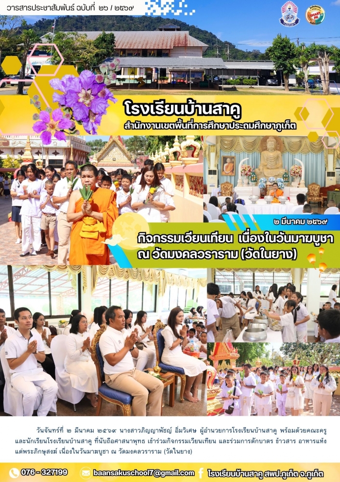 วันจันทร์ที่ ๒ มีนาคม ๒๕๖๙ นางสาวภิญญาพัชญ์ อิ่มวิเศษ ผู้อำนวยการโรงเรียนบ้านสาคู พร้อมด้วยคณะครู และนักเรียนโรงเรียนบ้านสาคู ที่นับถือศาสนาพุทธ เข้าร่วมกิจกรรมเวียนเทียน และร่วมการตักบาตร ข้าวสาร อาหารแห้ง แด่พระภิกษุสงฆ์ เนื่องในวันมาฆบูชา ณ วัดมงคลวราราม (วัดในยาง)