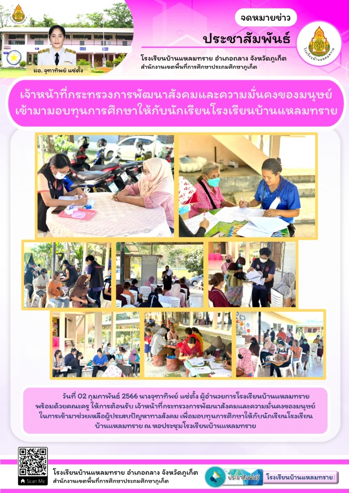 วันที่ 02 กุมภาพันธ์ 2566 นางจุฑาทิพย์ แซ่ตั้ง ผู้อำนวยการโรงเรียนบ้านแหลมทราย พร้อมด้วยคณะครู ให้การต้อนรับ เจ้าหน้าที่กระทรวงการพัฒนาสังคมและความมั่นคงของมนุษย์ ในการเข้ามาช่วยเหลือผู้ประสบปัญหาทางสังคม เพื่อมอบทุนการศึกษาให้กับนักเรียนโรงเรียนบ้านแหลมทราย ณ หอประชุมโรงเรียนบ้านแหลมทราย