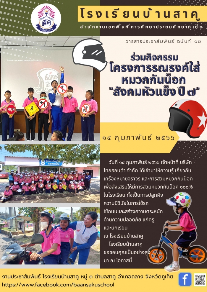 วันที่ ๑๔ กุมภาพันธ์ ๒๕๖๖ เจ้าหน้าที่ บริษัท ไทยฮอนด้า จำกัด ได้เข้ามาให้ความรู้ เกี่ยวกับเครื่องหมายจราจร และการสวมหมวกกันน็อค เพื่อส่งเสริมให้มีการสวมหมวกกันน็อค ๑๐๐% ในโรงเรียน ทั้งเป็นการปลูกฝังความมีวินัยในการใช้รถใช้ถนน และสร้างความตระหนักด้านความปลอดภัยแก่ครู และนักเรียน ณ โรงเรียนบ้านสาคู โรงเรียบน้านสาคู ขอขอบคุณเป็นอย่างสูงมา ณ โอกาสนี้