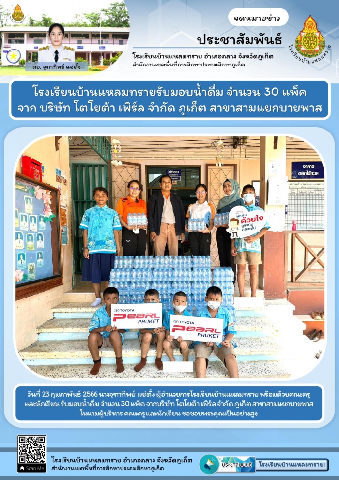 โรงเรียนบ้านแหลมทรายรับมอบน้ำดื่ม จำนวน 30 แพ็ค จาก บริษัท โตโยต้า เพิร์ล จำกัด ภูเก็ต สาขาสามแยกบายพาส