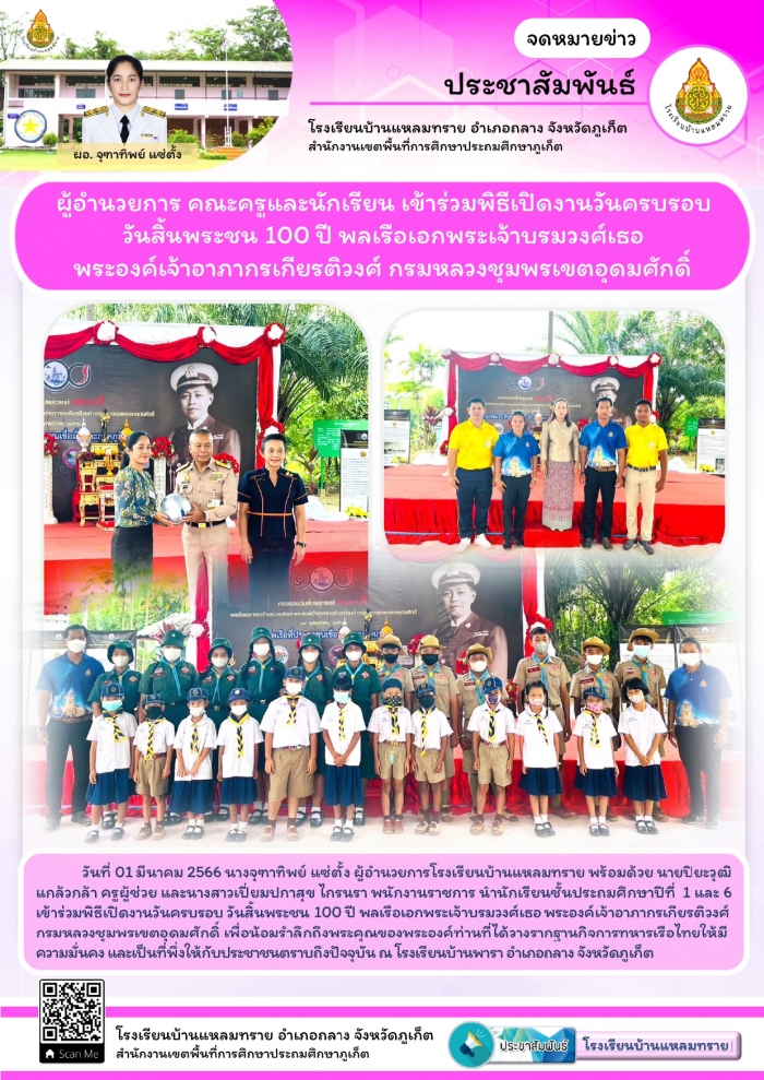 วันที่ 01 มีนาคม 2566 นางจุฑาทิพย์ แซ่ตั้ง ผู้อำนวยการโรงเรียนบ้านแหลมทราย พร้อมด้วย นายปิยะวุฒิ แกล้วกล้า ครูผู้ช่วย และนางสาวเปี่ยมปกาสุข ไกรนรา พนักงานราชการ นำนักเรียนชั้นประถมศึกษาปีที่ 1 และ 6 เข้าร่วมพิธีเปิดงานวันครบรอบ วันสิ้นพระชน 100 ปี พลเรือเอกพระเจ้าบรมวงศ์เธอ พระองค์เจ้าอาภากรเกียรติวงศ์ กรมหลวงชุมพรเขตอุดมศักดิ์ เพื่อน้อมรำลึกถึงพระคุณของพระองค์ท่านที่ได้วางรากฐานกิจการทหารเรือไทยให้มีความมั่นคง และเป็นที่พึ่งให้กับประชาชนตราบถึงปัจจุบัน ณ โรงเรียนบ้านพารา อำเภอถลาง จังหวัดภูเก็ต