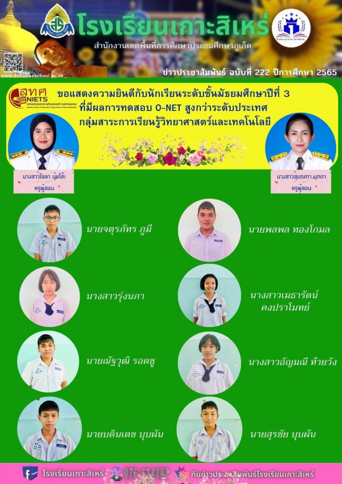 ขอแสดงความยินดีกับนักเรียน ม.3 ที่มีผลการทดสอบ O-NET สูงกว่าระดับประเทศ กลุ่มสาระการเรียนรู้วิทยาศาสตร์และเทคโนโลยี