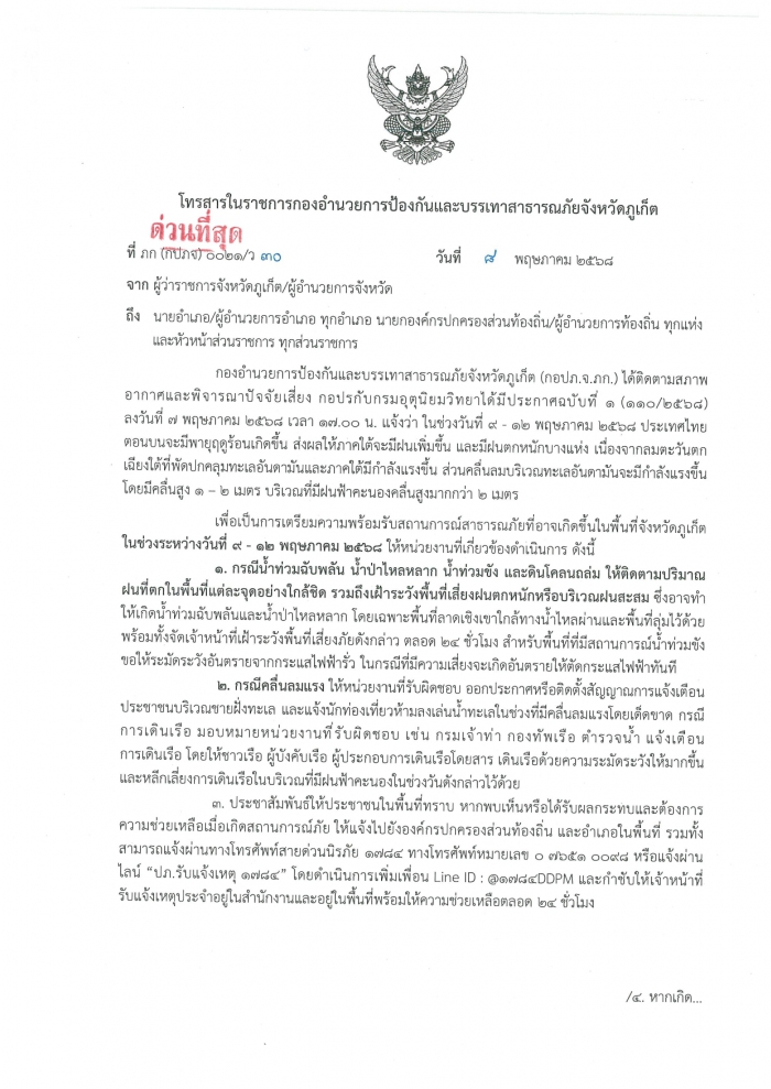 โทรสารแจ้งเตือนเฝ้าระวังสถานการณ์น้ำท่วมฉับพลัน น้ำป่าไหลหลาก น้ำท่วมขัง ดินโคลนถล่ม และคลื่นลมแรง ระหว่างวันที่ 9 - 12 พฤษภาคม 2568