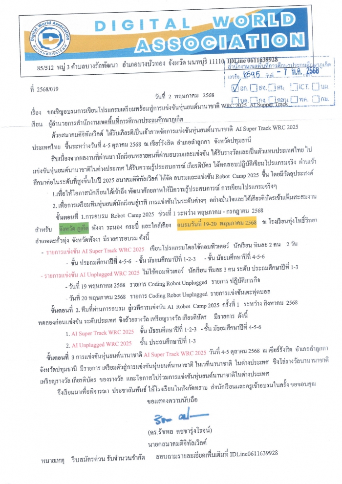 เชิญอบรมการเขียนโปรแกรมเตรียมความพร้อมสู่การแข่งขันหุ่นยนต์นานาชาติ WRC2025 AL Supper Track