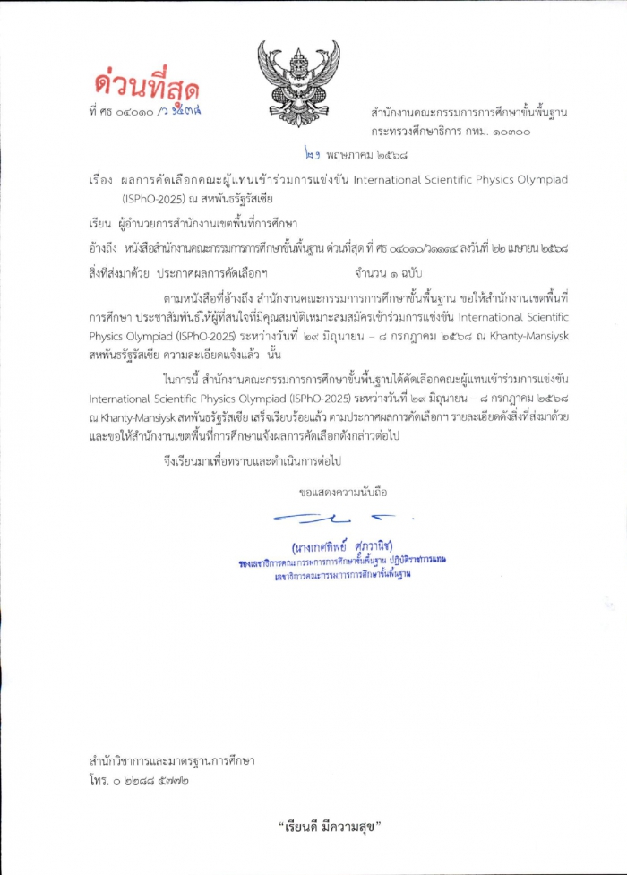 ผลการคัดเลือกคณะผู้แทนเข้าร่วมการแข่งขัน International Scientific Physics Olympiad (ISPhO-2025) ณ สหพันธรัฐรัสเซีย