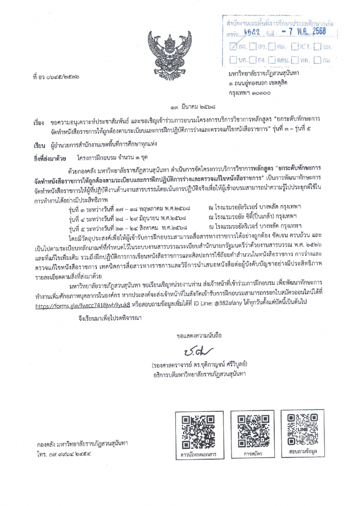 เชิญเข้าร่วมการอบรมโครงการบริการวิชาการหลักสูตร ยกระดับทักษะการจัดทำหนังสือราชการให้ถูกต้องตามระเบียนให้ถูกต้องฯรุ่นที่3 ถึงรุ่นที่ 5