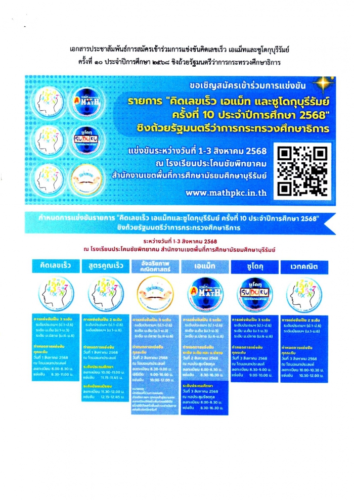 ประชาสัมพันธ์การับสมัครเข้าร่วมการแข่งขันคิดเลขเร็ว เอแม็ทและชูโดกุบุรีรัมย์ ครั้งที่ 10 ประจำปีการศึกษา 2568