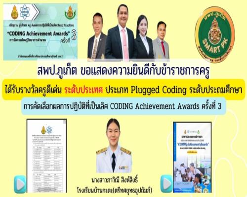 สพป.ภูเก็ต ขอแสดงความยินดีกับข้าราชการครู ได้รับรางวัลครูผู้สอนดีเด่น การคัดเลือกผลการปฏิบัติที่เป็นเลิศ CODING Achievement Awards ครั้งที่ 3