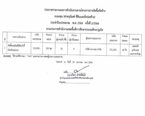 ประกาศรายงานผลการดำเนินงานตามโครงการการจัดซื้อจัดจ้าง งบลงทุน (ค่าครุภัณฑ์ ที่ดินและสิ่งก่อสร้าง) ประจำปีงบประมาณ พ.ศ.2566 ครั้งที่ 2/2566