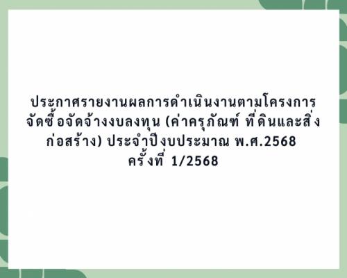 ประกาศรายงานผลการดำเนินงานตามโครงการจัดซื้อจัดจ้างงบลงทุน (ค่าครุภัณฑ์ ที่ดินและสิ่งก่อสร้าง) ประจำปีงบประมาณ พ.ศ.2568 ครั้งที่ 1/2568