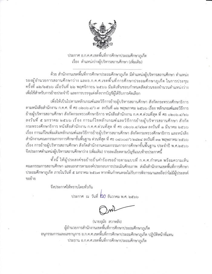 ประกาศ อ.ก.ค.ศ.เขตพื้นที่การศึกษาประถมศึกษาภูเก็ต เรื่อง ตำแหน่งว่างผู้บริหารสถานศึกษา (เพิ่มเติม)