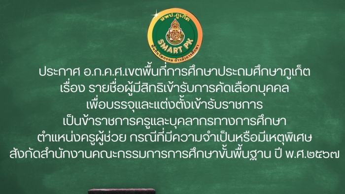 ประกาศ อ.ก.ค.ศ.เขตพื้นที่การศึกษาประถมศึกษาภูเก็ต เรื่อง รายชื่อผู้มีสิทธิเข้ารับการคัดเลือกบุคคล เพื่อบรรจุและแต่งตั้งเข้ารับราชการ เป็นข้าราชการครูแ
