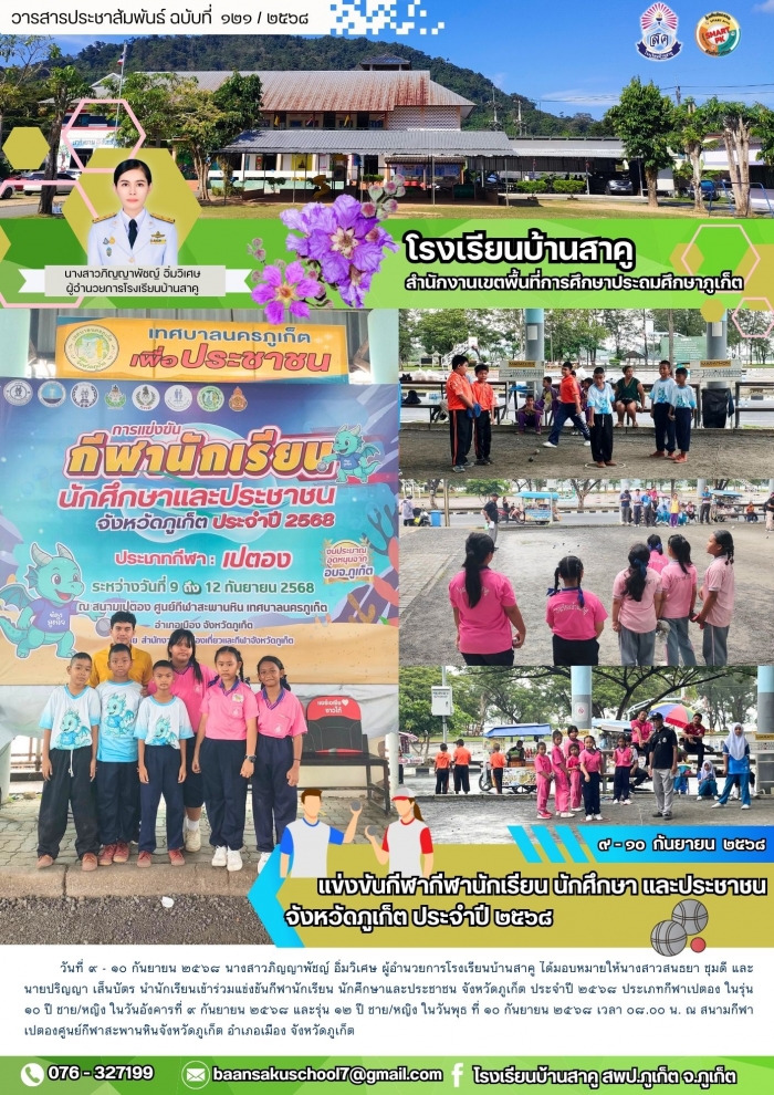 วันที่ ๙ - ๑๐ กันยายน ๒๕๖๘ นางสาวภิญญาพัชญ์ อิ่มวิเศษ ผู้อำนวยการโรงเรียนบ้านสาคู ได้มอบหมายให้นางสาวสนธยา ชุมดี และนายปริญญา เส็นบัตร นำนักเรียนเข้าร่วมแข่งขันกีฬานักเรียน นักศึกษาและประชาชน จังหวัดภูเก็ต ประจำปี ๒๕๖๘ ประเภทกีฬาเปตอง ในรุ่น ๑๐ ปี ชาย/หญิง ในวันอังคารที่ ๙ กันยายน ๒๕๖๘ และรุ่น ๑๒ ปี ชาย/หญิง ในวันพุธ ที่ ๑๐ กันยายน ๒๕๖๘ เวลา ๐๘.๐๐ น. ณ สนามกีฬา เปตองศูนย์กีฬาสะพานหินจังหวัดภูเก็ต อำเภอเมือง จังหวัดภูเก็ต