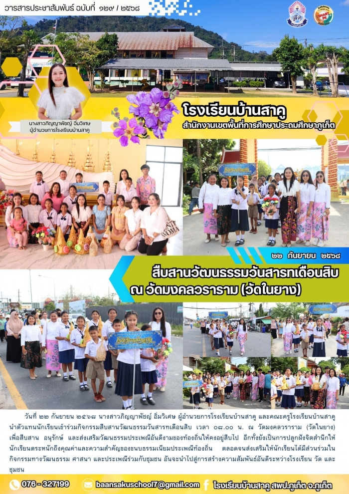 วันที่ ๒๒ กันยายน ๒๕๖๘ นางสาวภิญญาพัชญ์ อิ่มวิเศษ ผู้อำนวยการโรงเรียนบ้านสาคู และคณะครูโรงเรียนบ้านสาคู นำตัวแทนนักเรียนเข้าร่วมกิจกรรมสืบสานวัฒนธรรมวันสารทเดือนสิบ เวลา ๐๘.๐๐ น. ณ วัดมงคลวราราม (วัดในยาง) เพื่อสืบสาน อนุรักษ์ และส่งเสริมวัฒนธรรมประเพณีอันดีงามของท้องถิ่นให้คงอยู่สืบไป อีกทั้งยังเป็นการปลูกฝังจิตสำนึกให้นักเรียนตระหนักถึงคุณค่าและความสำคัญของขนบธรรมเนียมประเพณีท้องถิ่น ตลอดจนส่งเสริมให้นักเรียนได้มีส่วนร่วมในกิจกรรมทางวัฒนธรรม ศาสนา และประเพณีร่วมกับชุมชน อันจะนำไปสู่การสร้างความสัมพันธ์อันดีระหว่างโรงเรียน วัด และชุมชน