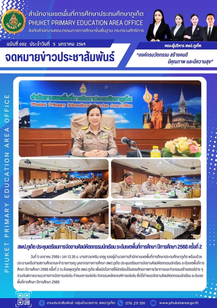 วันที่ 5 มกราคม 2569 เ วลา 13.30 น. นางสาวเกศริน เกตุชู รองผู้อำนวยการสำนักงานเขตพื้นที่การศึกษาประถมศึกษาภูเก็ต พร้อมด้วยประธานเครือข่ายสถานศึกษาและข้าราชการครู บุคลากรทางการศึกษา สพป.ภูเก็ต ประชุมเตรียมการจัดงานศิลปหัตถกรรมนักเรียน ระดับเขตพื้นที่การศึกษา ปีการศึกษา 2568 ครั้งที่ 2 ณ ห้องพุดภูเก็ต สพป.ภูเก็ต เพื่อเปิดโอกาสให้นักเรียนได้แสดงศักยภาพทางวิชาการและกิจกรรมสร้างสรรค์ต่าง ๆ ร่วมกันพิจารณาแนวทางการจัดการแข่งขัน กำหนดการแข่งขัน กิจกรรมหลักเกณฑ์การแข่งขัน ซึ่งได้กำหนดจัดงานศิลปหัตถกรรมนักเรียน ระดับเขตพื้นที่การศึกษา ปีการศึกษา 2568