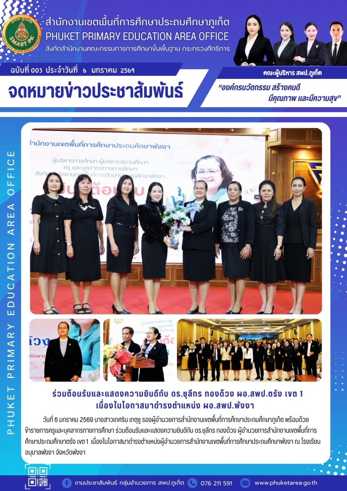 วันที่ 6 มกราคม 2569 นางสาวเกศริน เกตุชู รองผู้อำนวยการสำนักงานเขตพื้นที่การศึกษาประถมศึกษาภูเก็ต พร้อมด้วยข้าราชการครูและบุคลากรทางการศึกษา ร่วมต้อนรับและแสดงความยินดีกับ ดร.ชุลีกร ทองด้วง ผู้อำนวยการสำนักงานเขตพื้นที่การศึกษาประถมศึกษาตรัง เขต 1 เนื่องในโอกาสมาดำรงตำแหน่งผู้อำนวยการสำนักงานเขตพื้นที่การศึกษาประถมศึกษาพังงา ณ โรงเรียนอนุบาลพังงา จังหวัดพังงา