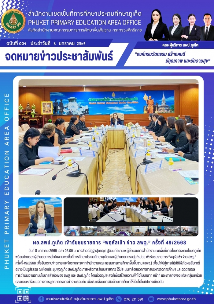 วันที่ 8 มกราคม 2569 เวลา 08.00 น. นางสาวณัฎฐาสุภคญา ฐิตินนท์ธนานพ ผู้อำนวยการสำนักงานเขตพื้นที่การศึกษาประถมศึกษาภูเก็ต พร้อมด้วยรองผู้อำนวยการสำนักงานเขตพื้นที่การศึกษาประถมศึกษาภูเก็ต และผู้อำนวยการกลุ่ม/หน่วย เข้ารับชมรายการ พฤหัสเช้า ข่าว สพฐ. ครั้งที่ 49/2568 เพื่อรับทราบข่าวสารและข้อราชการจากสำนักงานคณะกรรมการการศึกษาขั้นพื้นฐาน (สพฐ.) เพื่อนำไปสู่การปฏิบัติให้เกิดผลสัมฤทธิ์อย่างเป็นรูปธรรม ณ ห้องประชุมพุดภูเก็ต สพป.ภูเก็ต ภายหลังการรับชมรายการ ได้ประชุมหารือแนวทางการบริหารจัดการศึกษา และติดตามผลการดำเนินงานตามนโยบายสำคัญของ สพฐ. และ สพป.ภูเก็ต โดยมีวัตถุประสงค์เพื่อสร้างความเข้าใจในบทบาท หน้าที่ และภารกิจของแต่ละกลุ่ม/หน่วย ตลอดจนหารือแนวทางการบูรณาการการทำงานร่วมกัน เพื่อขับเคลื่อนภารกิจด้านการศึกษาให้เป็นไปในทิศทางเดียวกัน