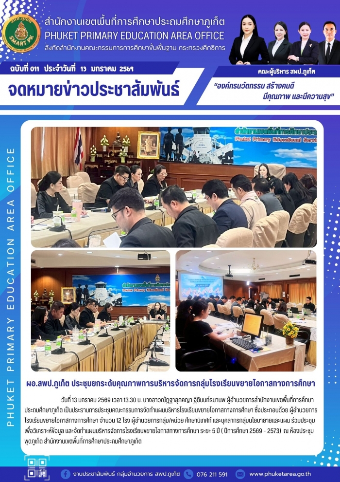 วันที่ 13 มกราคม 2569 เวลา 13.30 น. นางสาวณัฎฐาสุภคญา ฐิตินนท์ธนานพ ผู้อำนวยการสำนักงานเขตพื้นที่การศึกษาประถมศึกษาภูเก็ต เป็นประธานการประชุมคณะกรรมการจัดทำแผนบริหารโรงเรียนขยายโอกาสทางการศึกษา ซึ่งประกอบด้วย ผู้อำนวยการโรงเรียนขยายโอกาสทางการศึกษา จำนวน 12 โรง ผู้อำนวยการกลุ่ม/หน่วย ศึกษานิเทศก์ และบุคลากรกลุ่มนโยบายายและแผน ร่วมประชุม เพื่อวิเคราะห์ข้อมูล และจัดทำแผนบริหารจัดการโรงเรียนขยายโอกาสทางการศึกษา ระยะ 5 ปี ( ปีการศึกษา 2569 - 2573) ณ ห้องประชุมพุดภูเก็ต สำนักงานเขตพื้นที่การศึกษาประถมศึกษาภูเก็ต
