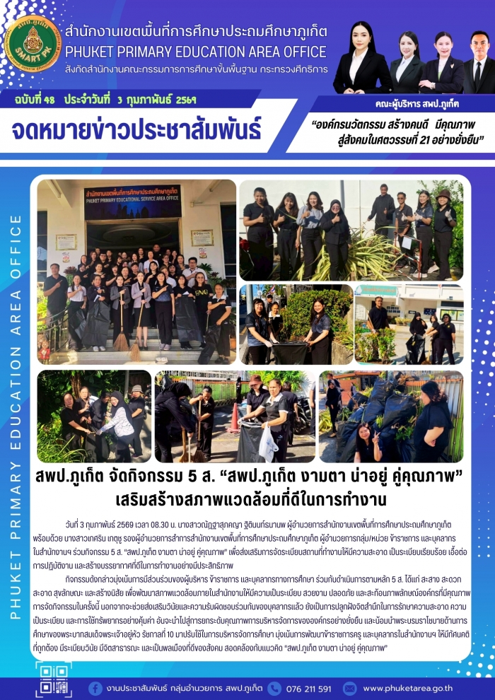 สพป.ภูเก็ต จัดกิจกรรม 5 ส. สพป.ภูเก็ต งามตา น่าอยู่ คู่คุณภาพ เสริมสร้างสภาพแวดล้อมที่ดีในการทำงาน