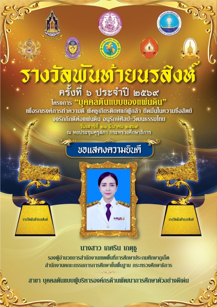 สพป.ภูเก็ต ขอแสดงความยินดีกับ นางสาวเกศริน เกตุชู รอง สพป.ภูเก็ต เนื่องในโอกาสได้รับ รางวัลพันท้ายนรสิงห์ ครั้งที่ 6 ประจำปี 256
