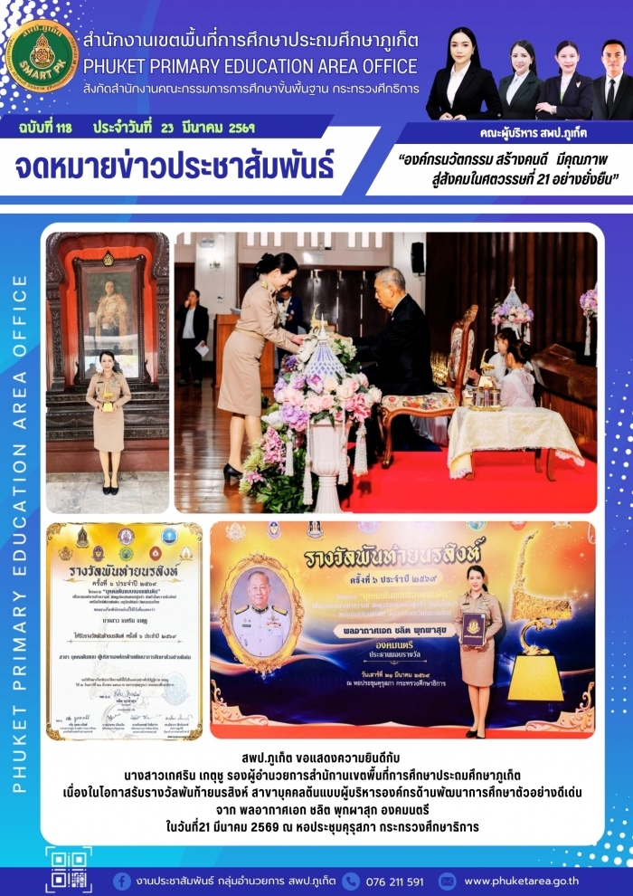 สพป.ภูเก็ต ขอแสดงความยินดีกับ นางสาวเกศริน เกตุชู รองผู้อำนวยการสำนักานเขตพื้นที่การศึกษาประถมศึกษาภูเก็ต เนื่องในโอกาสรับรางวัลพันท้ายนรสิงห์ สาขาบุคคลต้นแบบ ผู้บริหารองค์กรด้านพัฒนาการศึกษาตัวอย่างดีเด่น จาก พลอากาศเอก ชลิต พุกผาสุก องคมนตรี ในวันที่21 มีนาคม 2569 ณ หอประชุมคุรุสภา กระทรวงศึกษาธิการ